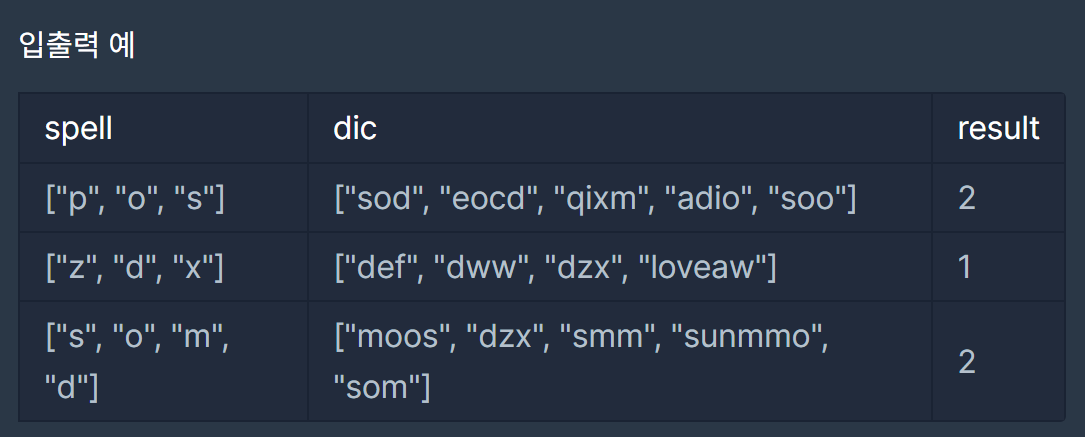 알파벳이 담긴 배열 spell과 외계어 사전 dic이 매개변수로 주어집니다.