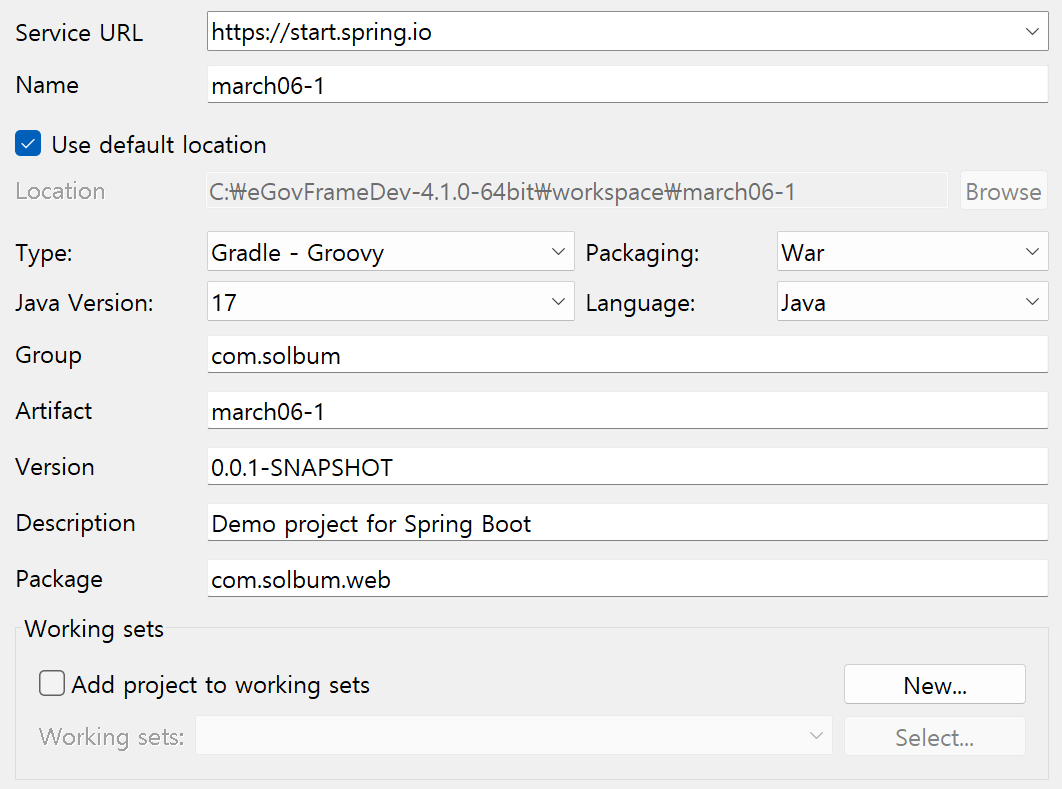 Type 은 gradle, Packaging : War, Group, Package 설정
